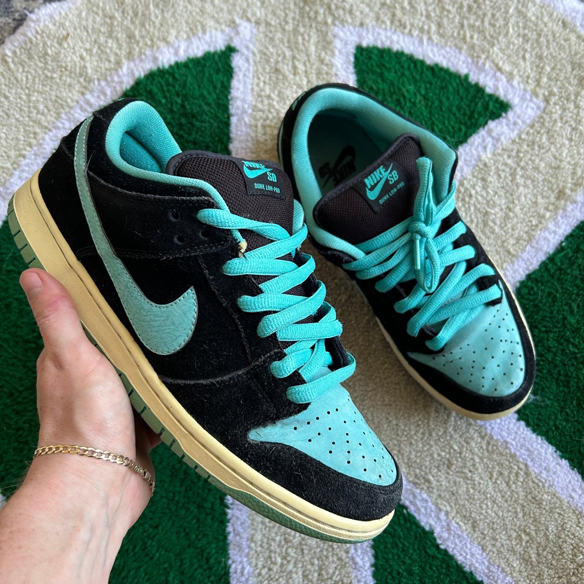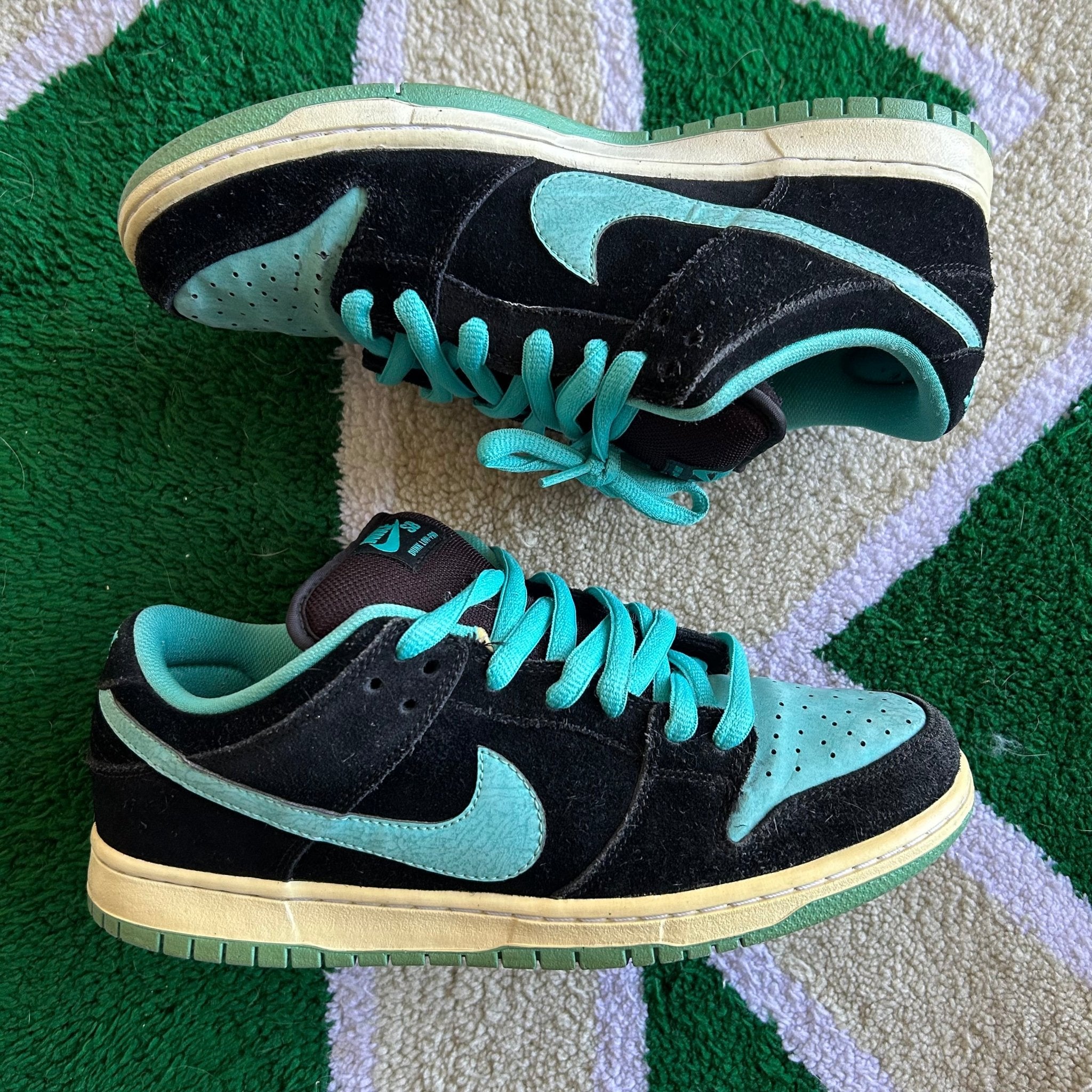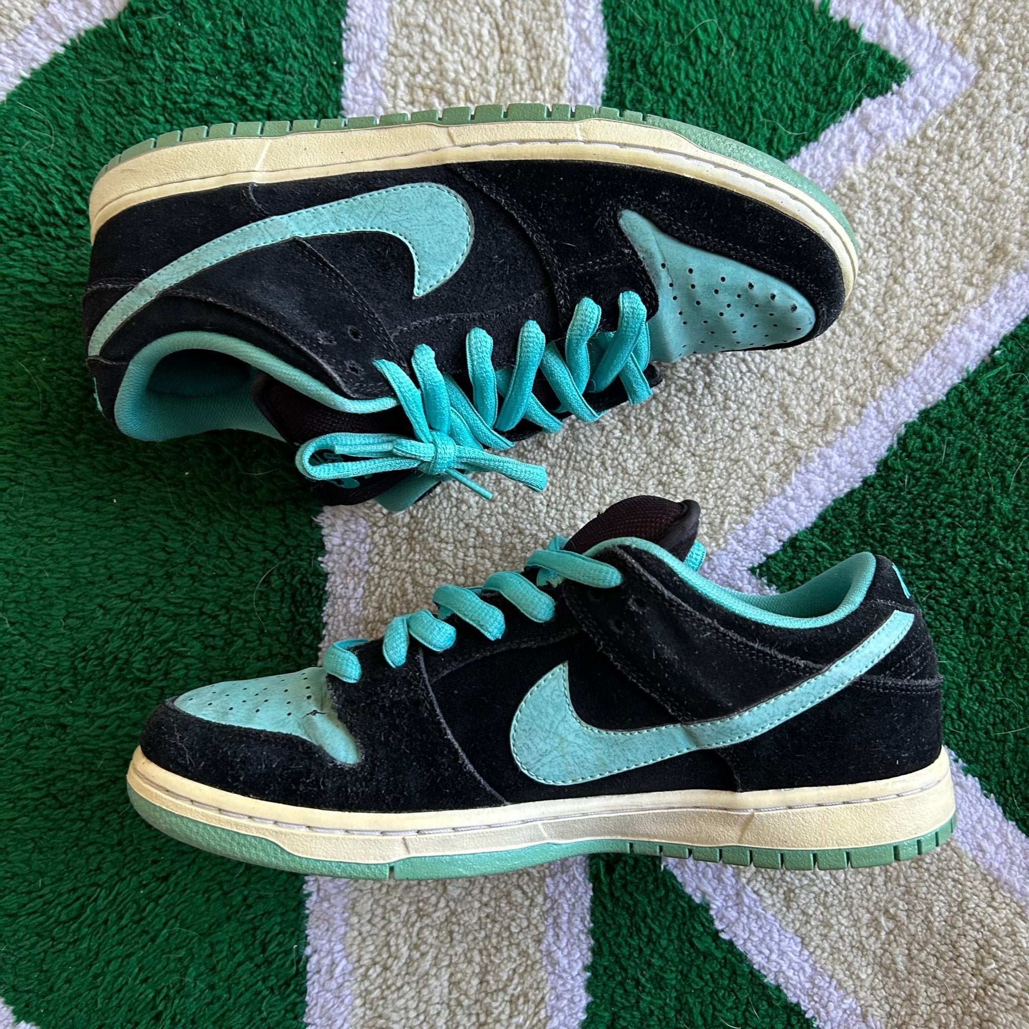 The Nike SB Dunk Low Clear Jade was released in 2011, it has been known as the "Tiffany J-Pack," is a sneaker that uses the iconic Tiffany colorway. It features a combination of black, white, and Clear Jade hues, with premium leather and suede materials. The design includes a contrasting white Nike Swoosh, Clear Jade accents on the heel tab and outsole, and nods to the classic Air Jordan 1 palette. It was apart of the blue SB box era that lasted from April 2009 - June 2012.