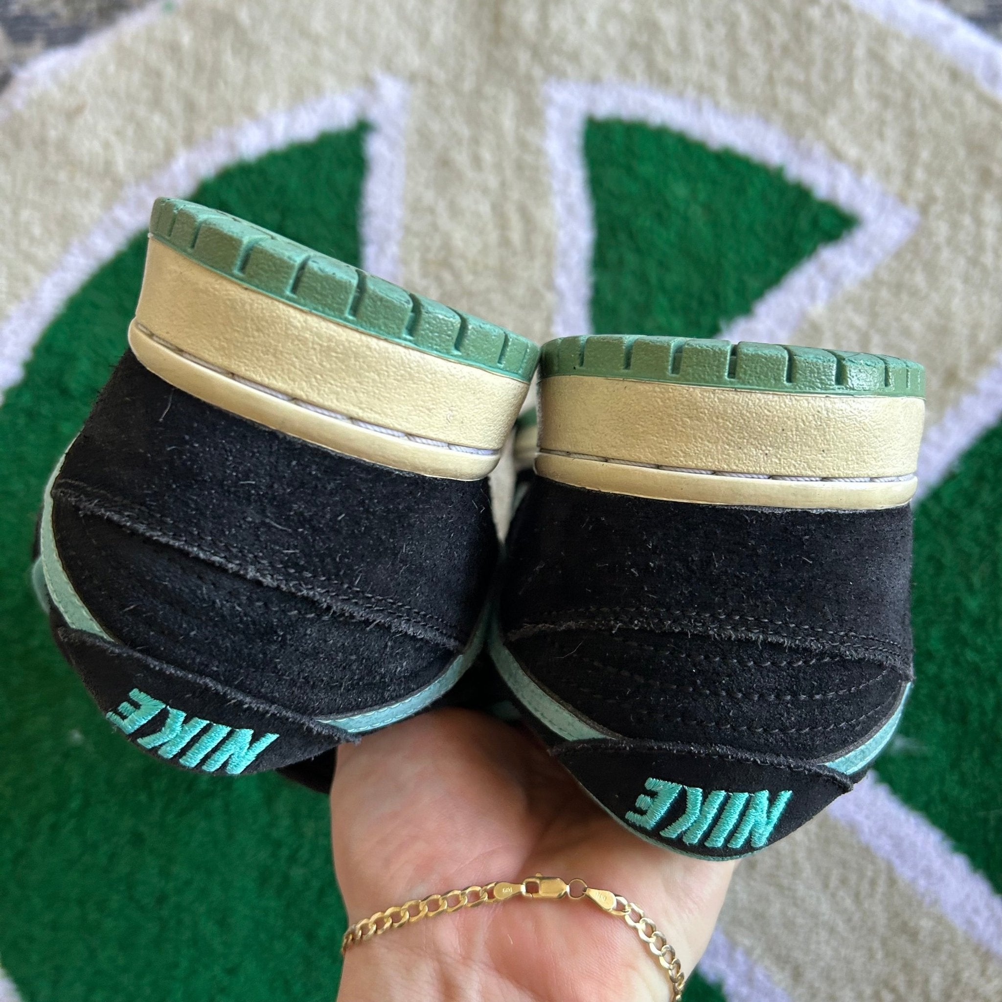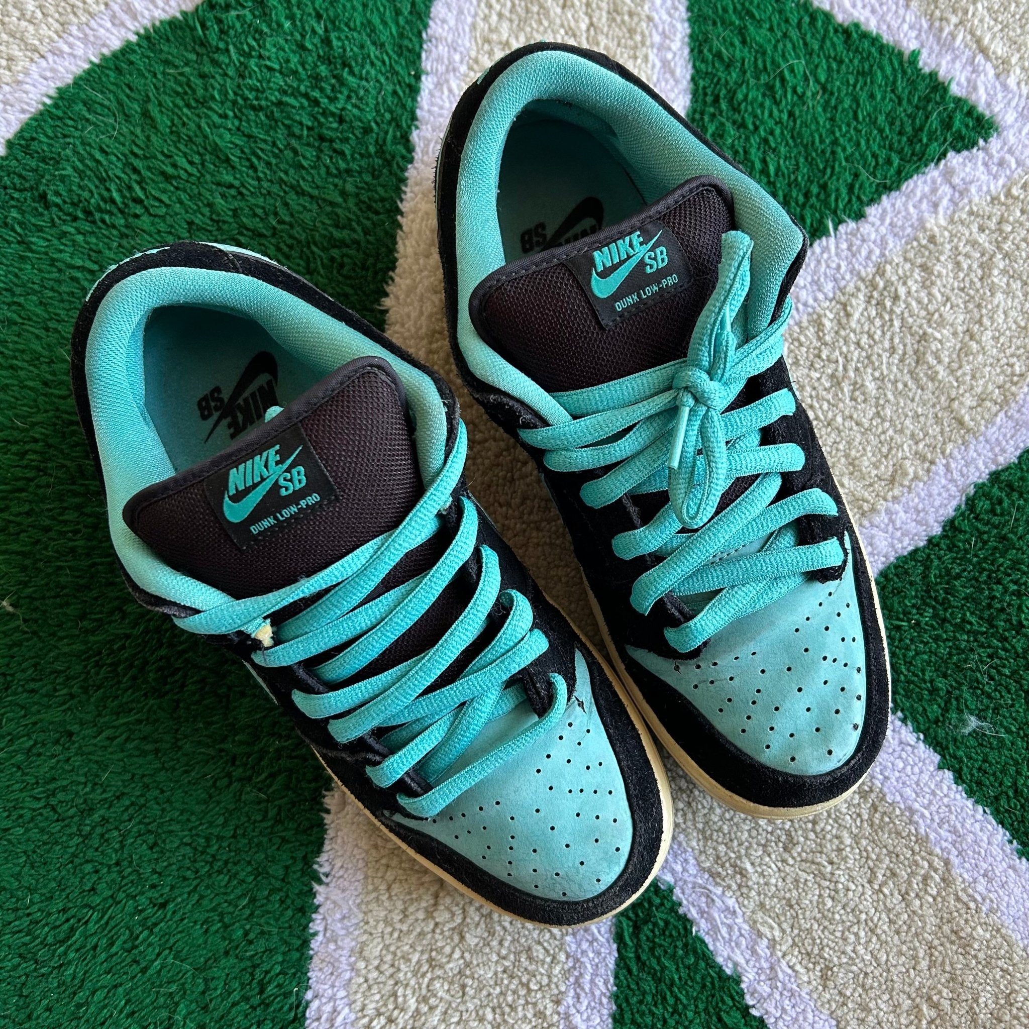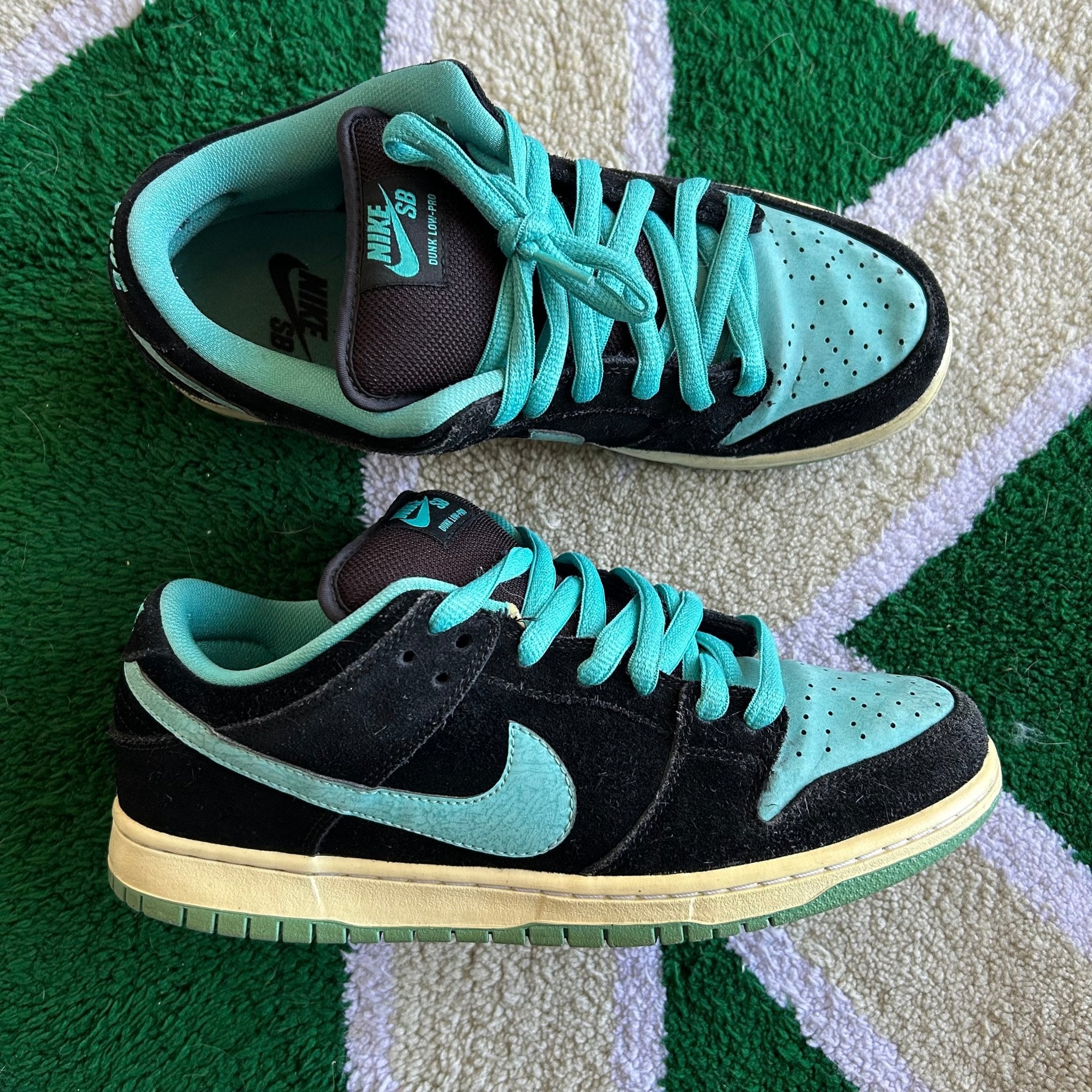 The Nike SB Dunk Low Clear Jade was released in 2011, it has been known as the "Tiffany J-Pack," is a sneaker that uses the iconic Tiffany colorway. It features a combination of black, white, and Clear Jade hues, with premium leather and suede materials. The design includes a contrasting white Nike Swoosh, Clear Jade accents on the heel tab and outsole, and nods to the classic Air Jordan 1 palette. It was apart of the blue SB box era that lasted from April 2009 - June 2012.