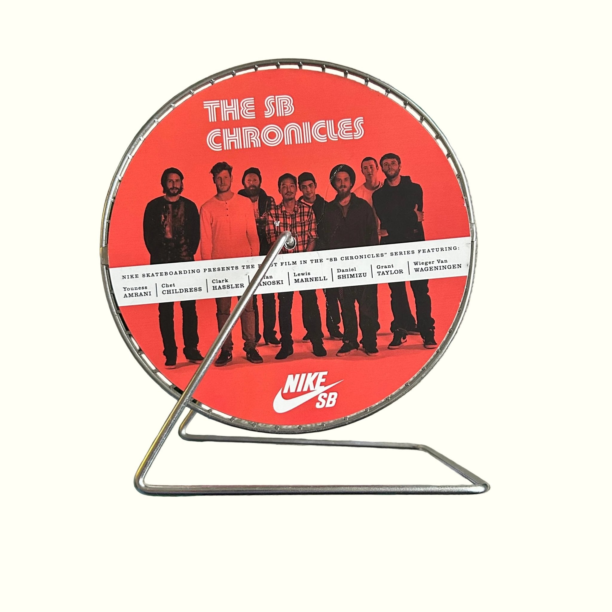 The Nike SB Hamster Wheel released in 2011 for the Skateboarding Chronicles film is a rare promotional display piece. It features unique images on each side and spins like a real wheel, making it a highly collectible retail display item. The SB Chronicles Vol. 1, a Nike SB video, premiered online on December 3, 2011, and features full parts from top riders, shot in HD by Jason Hernandez.