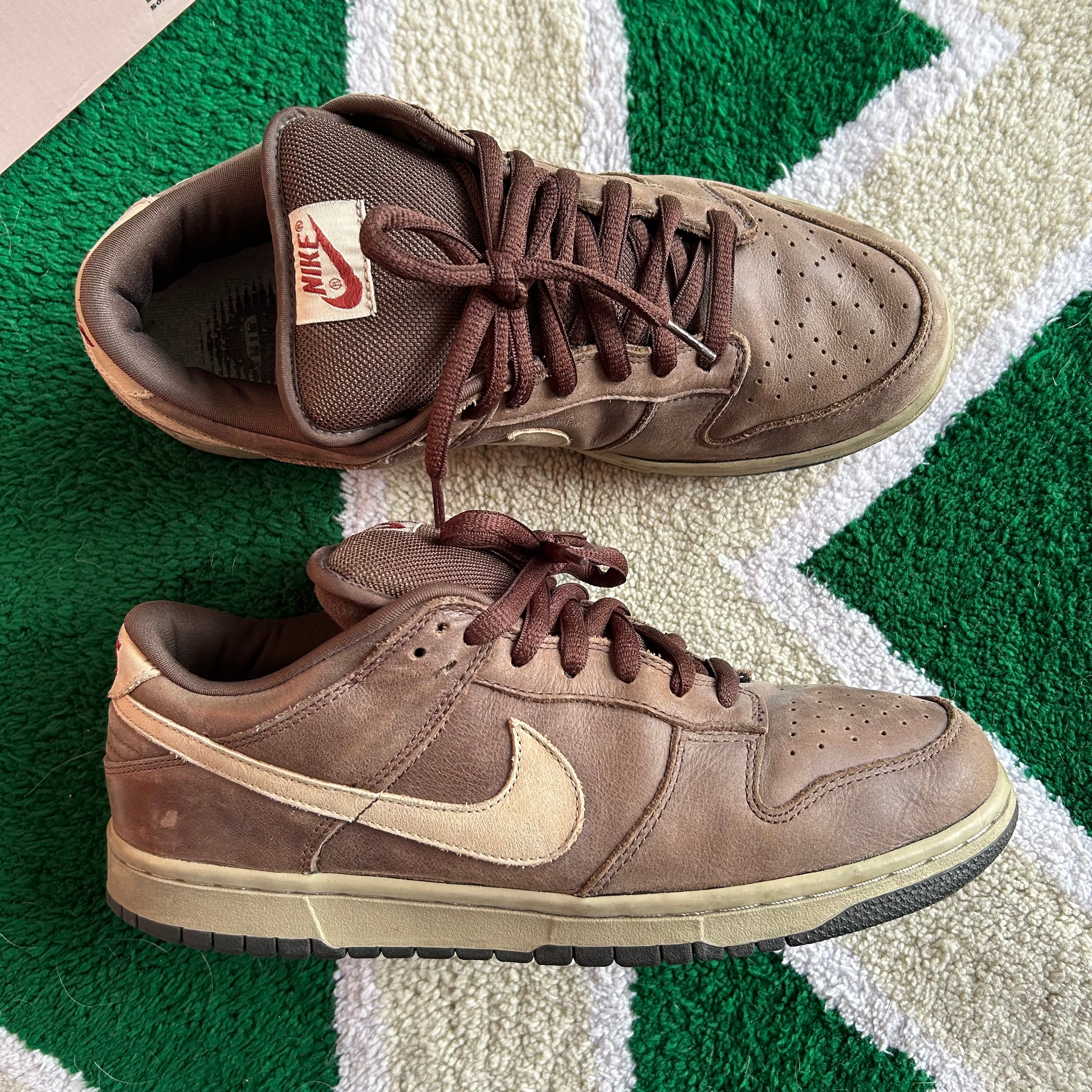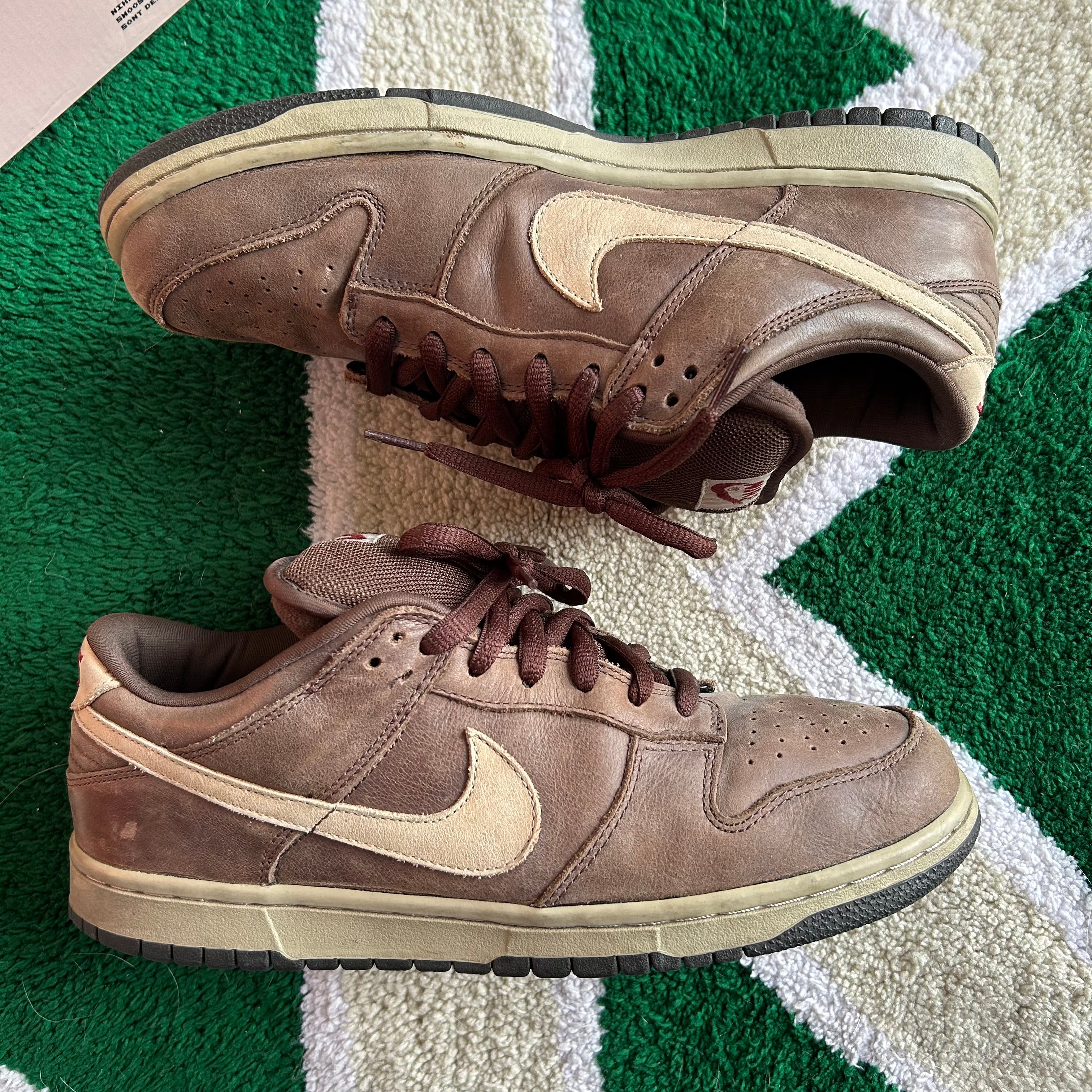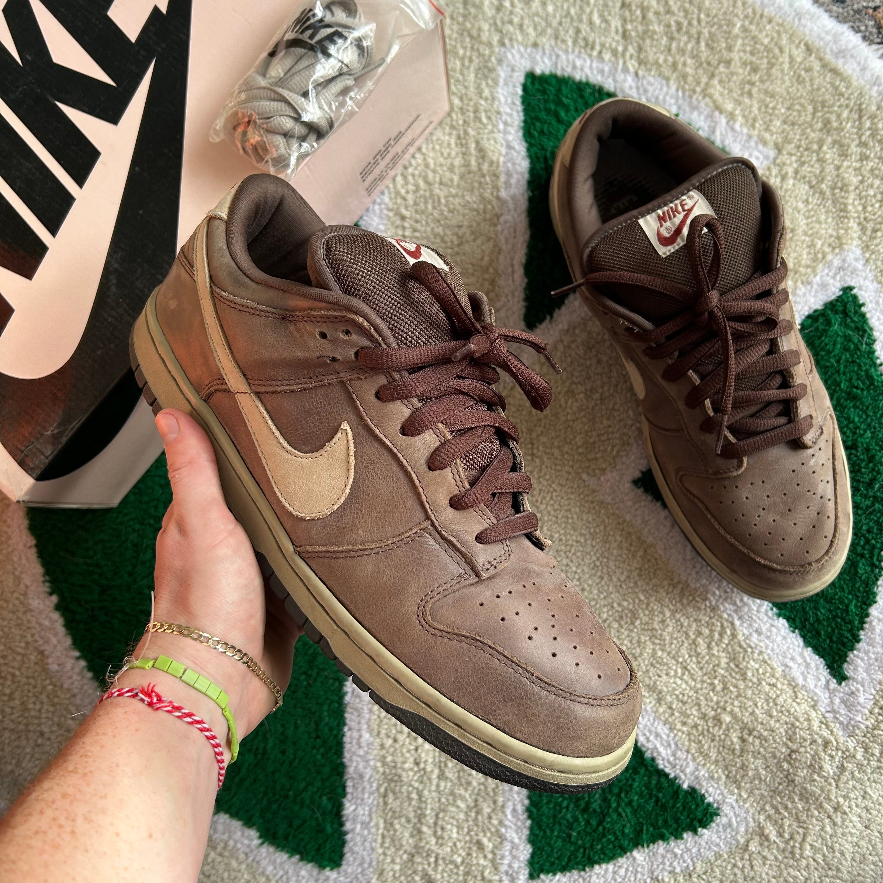The 2004 Nike SB Dunk Low "Mocha" features an official colorway of Dark Mocha/Chino. Unlike the 2007 SB Dunk Low Pro "Mocha," this model was crafted with premium leather and released during the pink box SB era. Red accents add a pop of contrast to the rich mocha tones. Notably, this version doesn’t feature "SB" on the tongue tag, as it was released before Nike SB added the branding to every tag, making it a unique piece in the Dunk SB lineage.