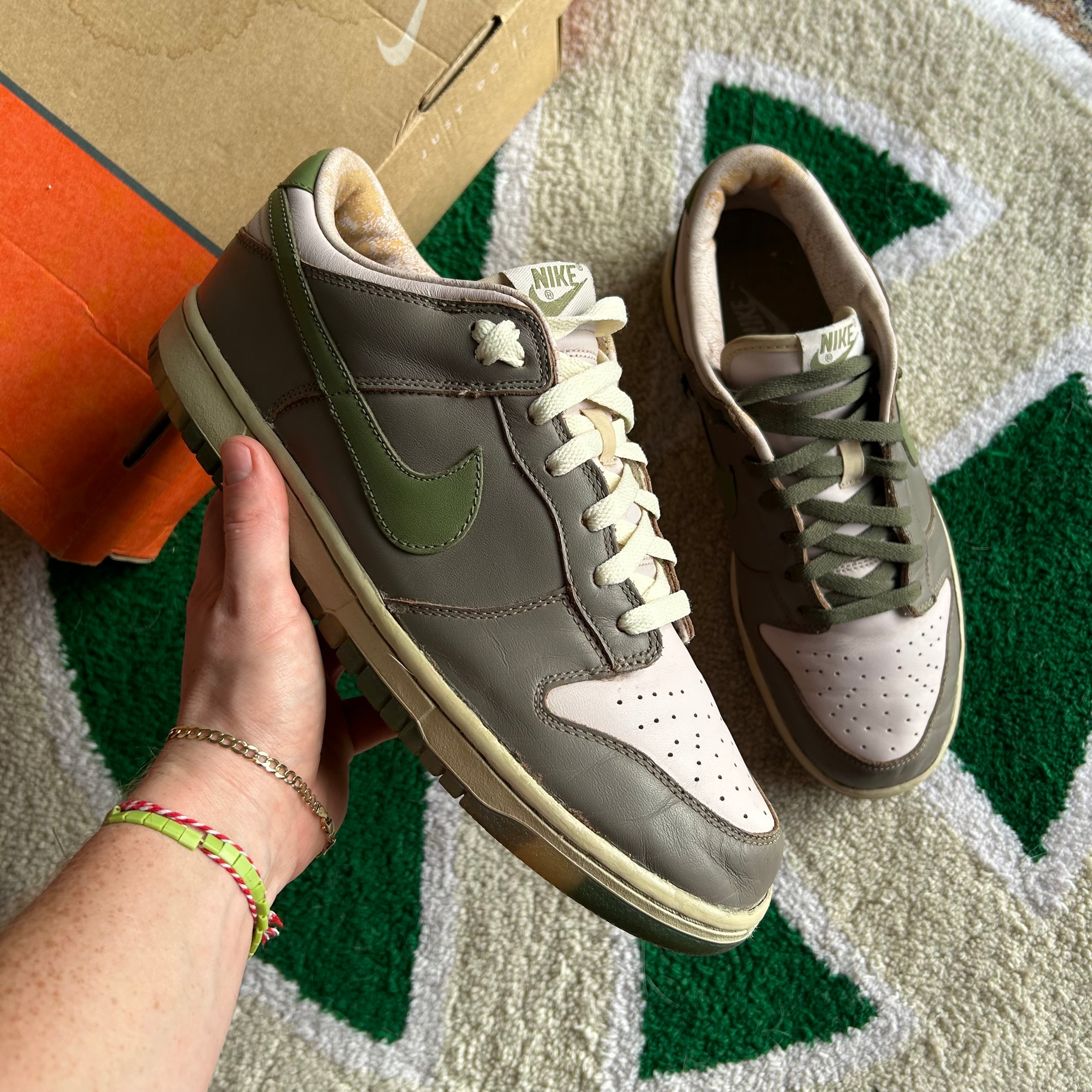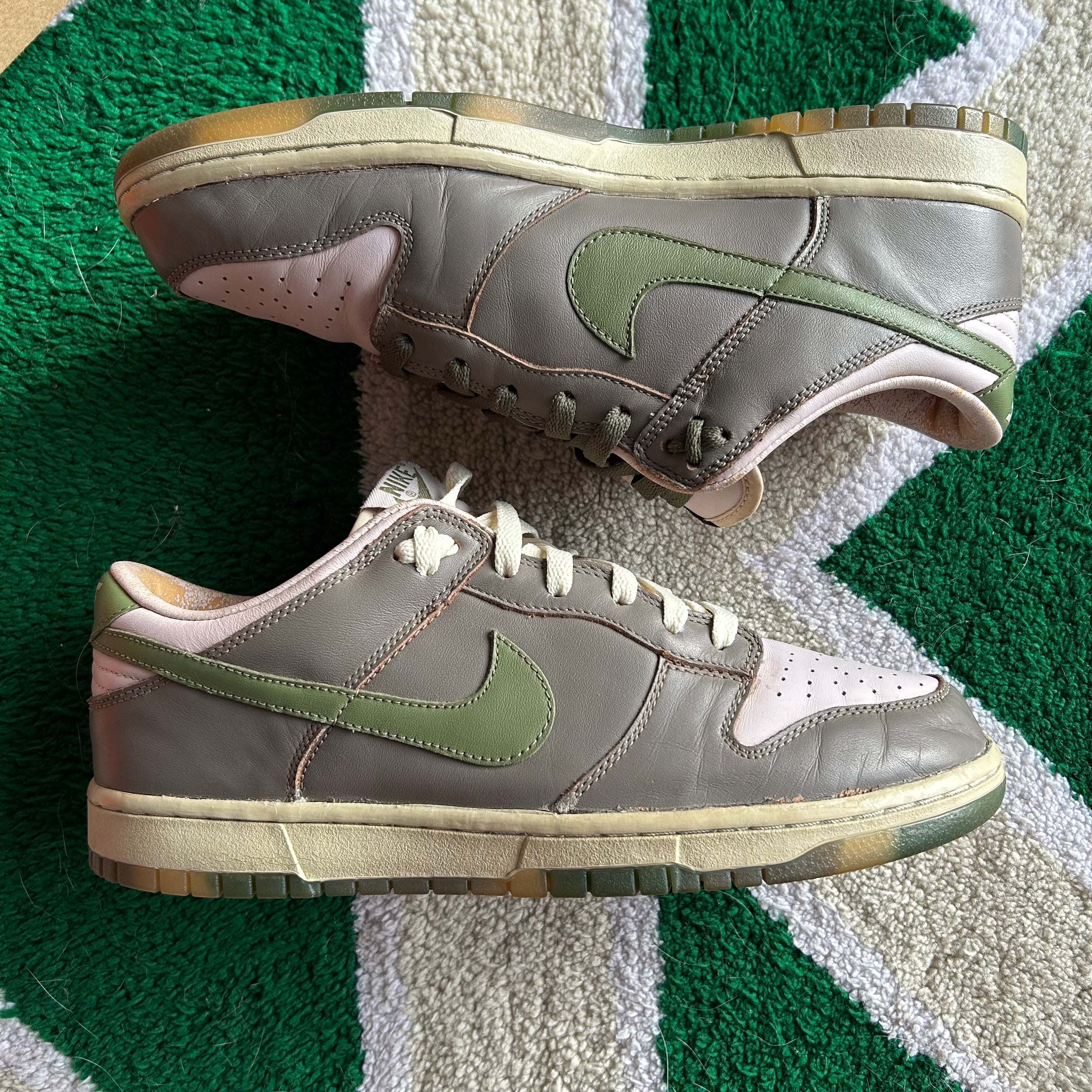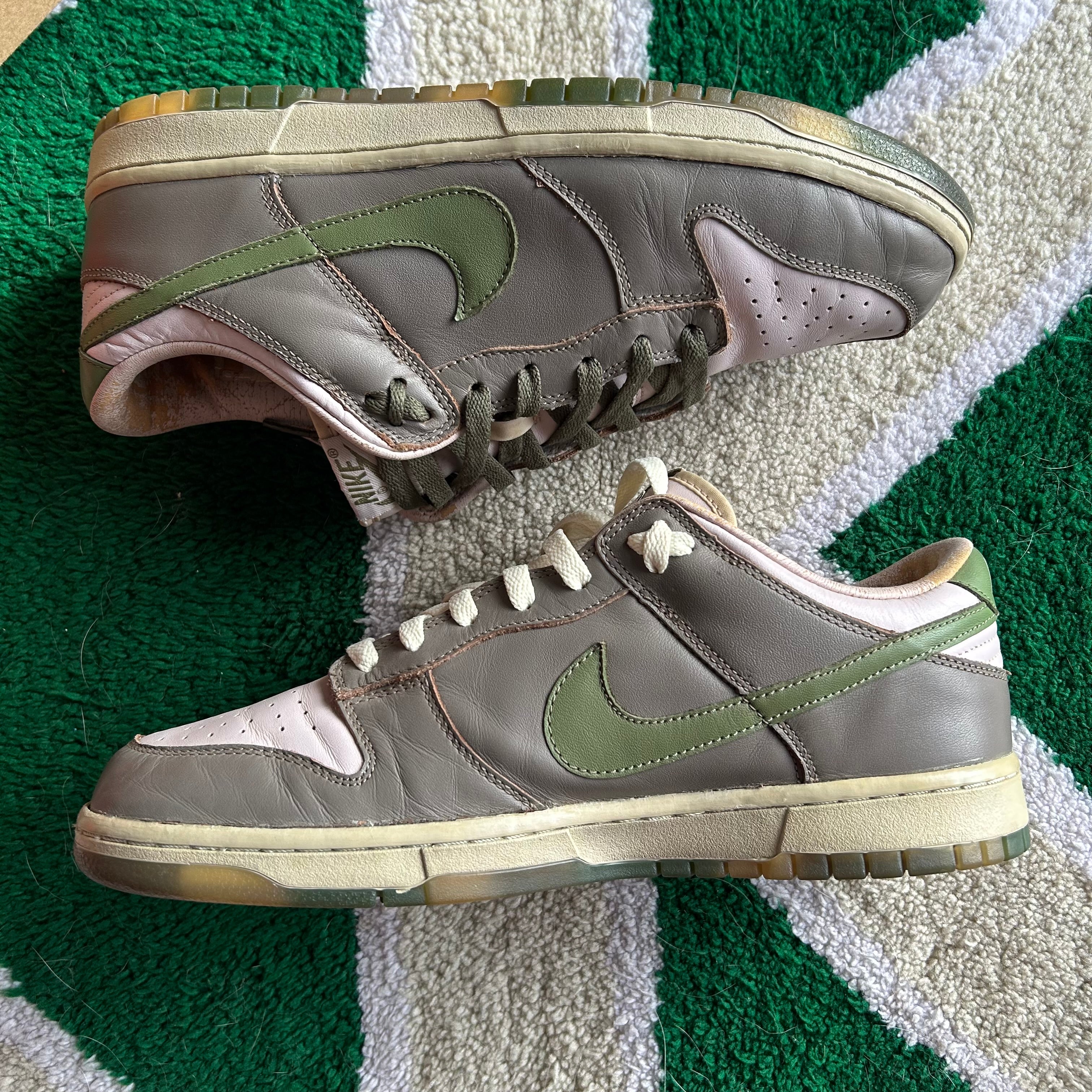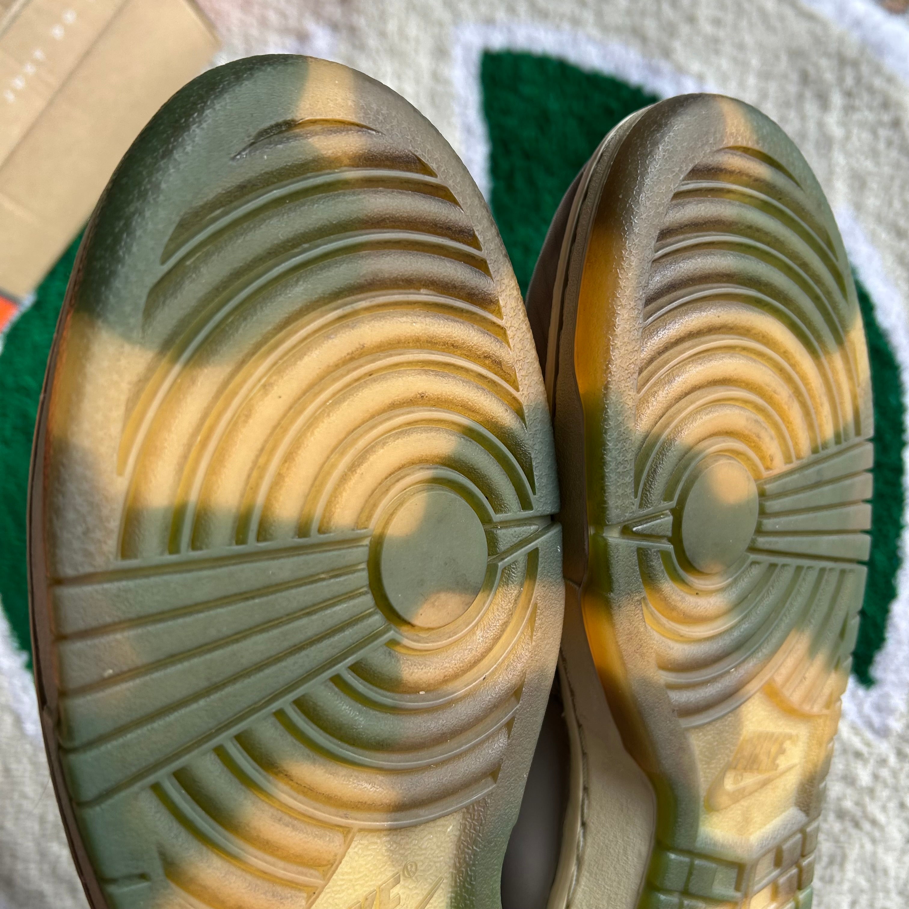 The Nike Dunk Low Army Olive released in 2005 and is an extremely rare pair with an army camo translucent sole, light grey leather uppers, and an olive green Swoosh and accents. A desirable pair for collectors due to its rarity.