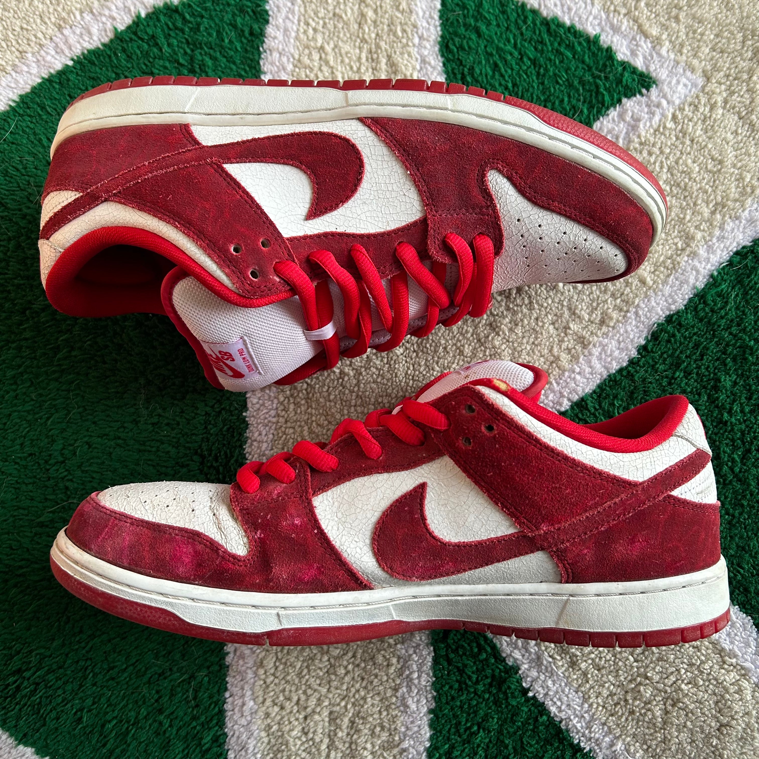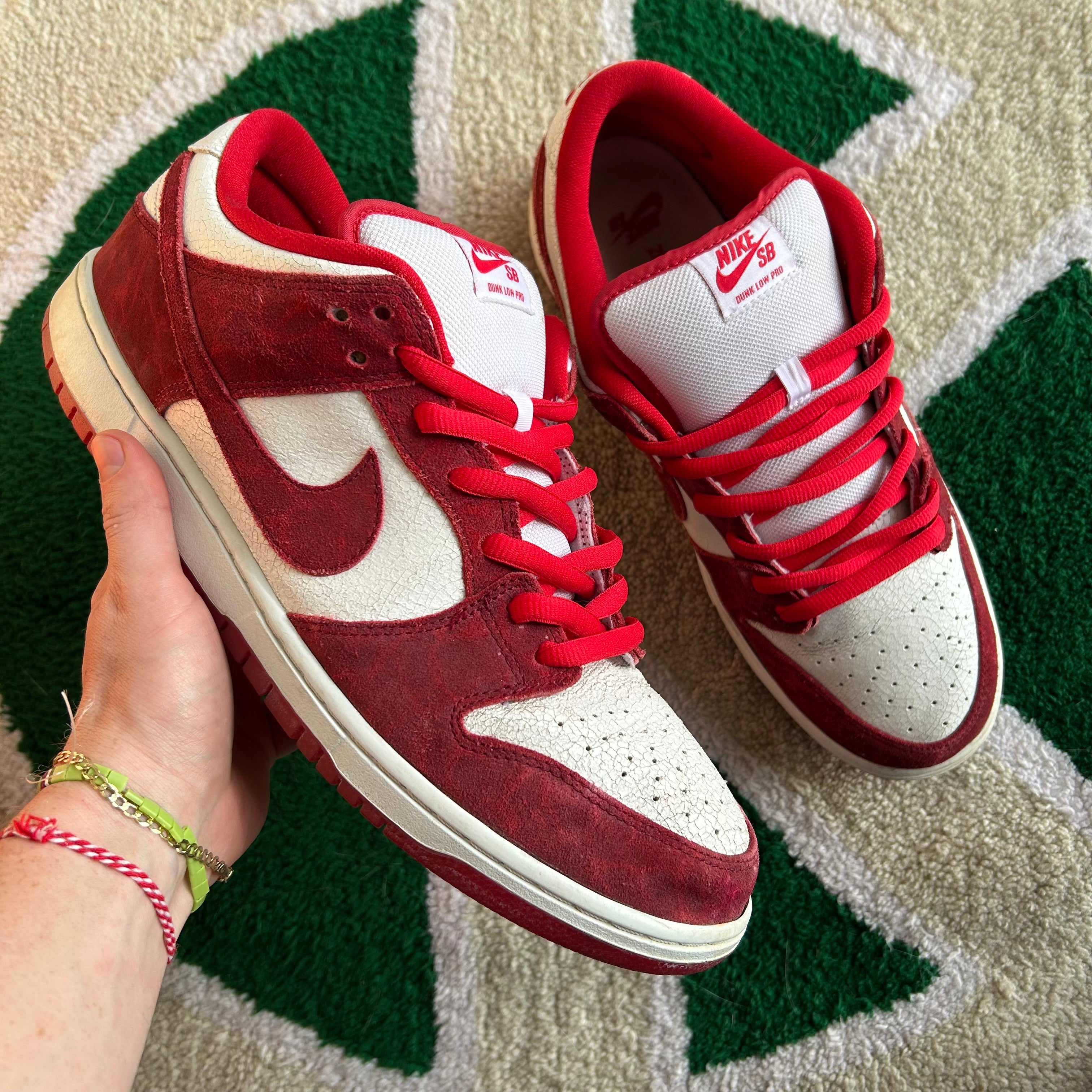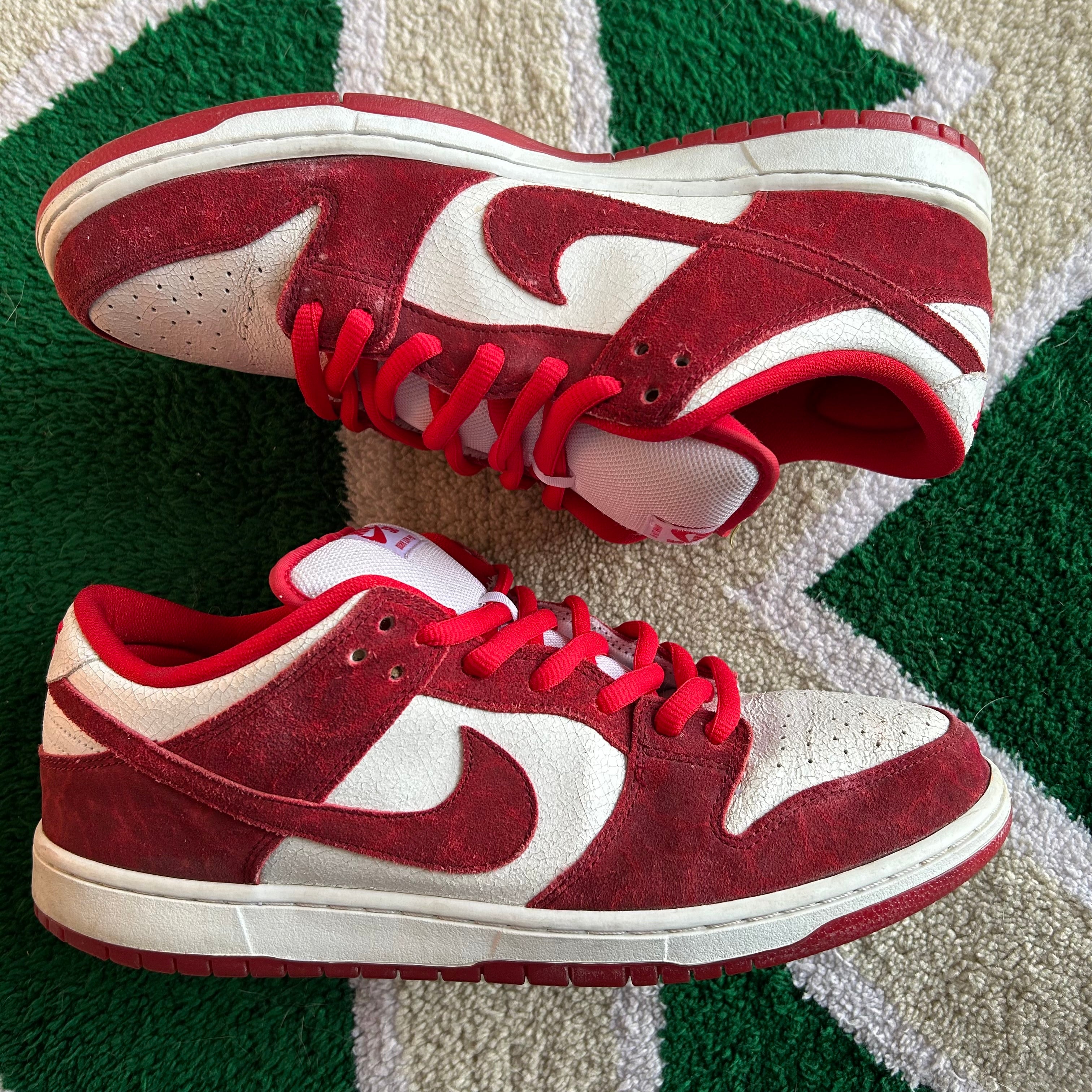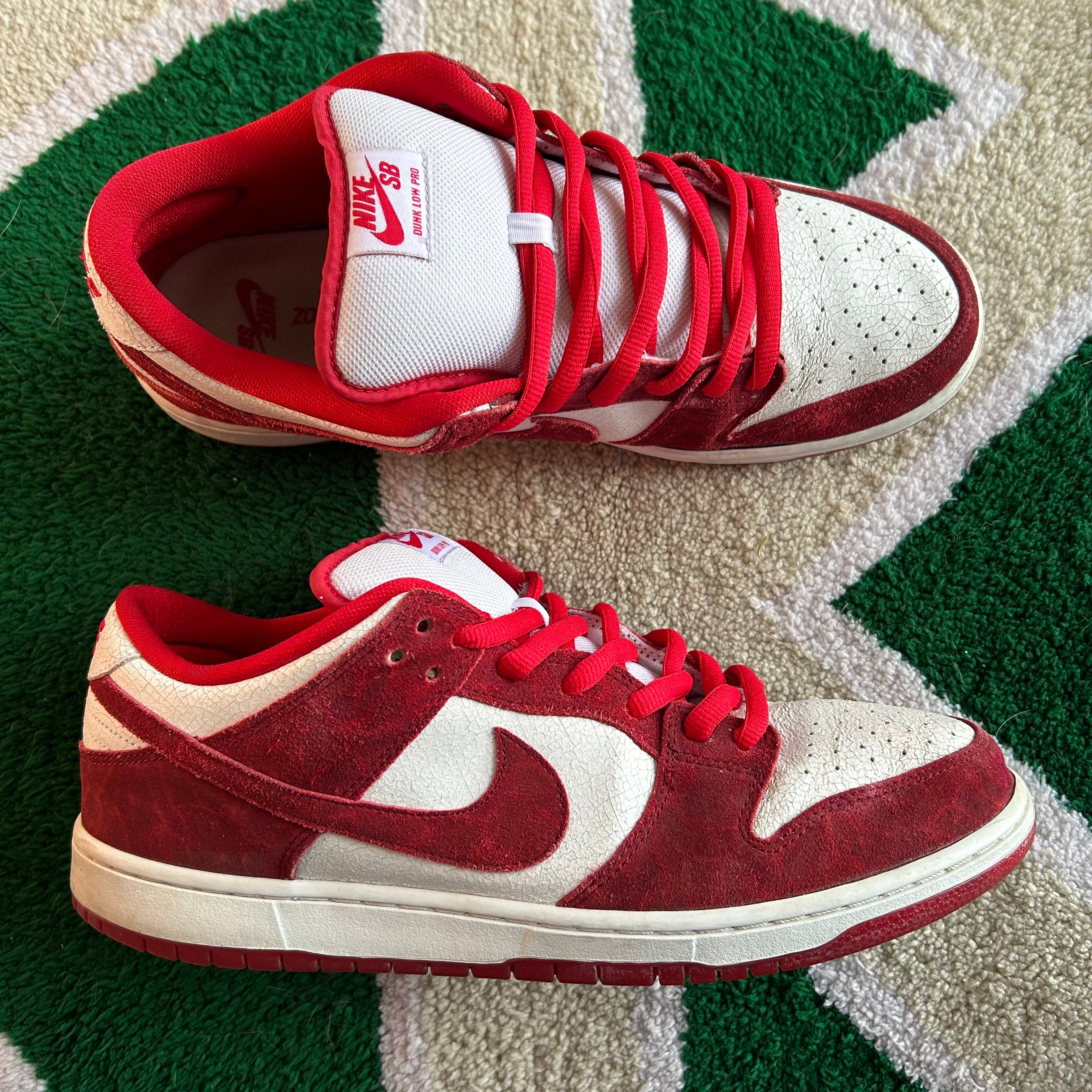The Nike SB Dunk Low "Valentine's Day" 2014, in its official University Red/University Red-White colorway, stands out with its unique red-toned suede featuring light and dark red highlights, combined with purposely cracked leather for added texture. The white midsole and red outsole perfectly complement the design, making it one of the best Valentine's Day SB releases to date