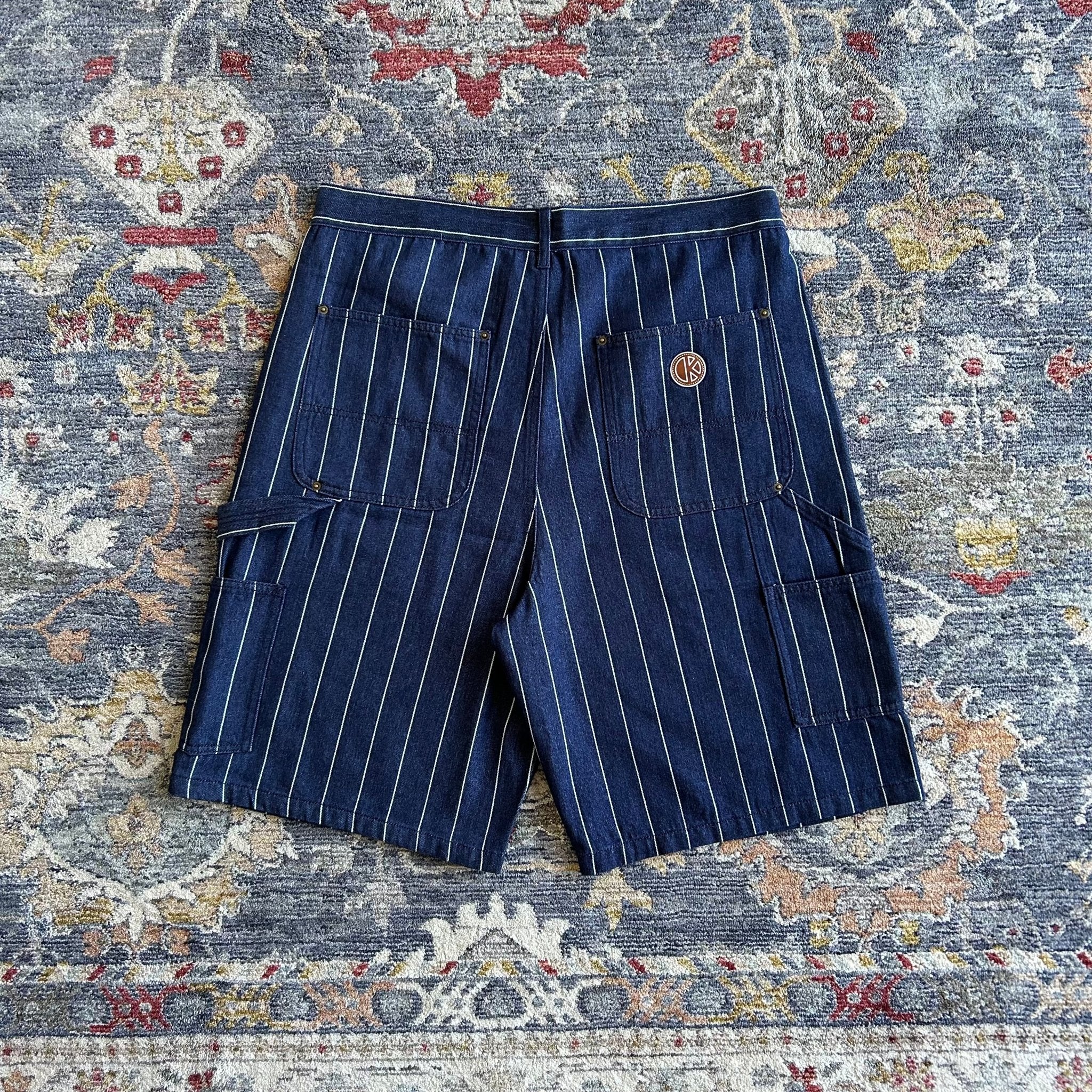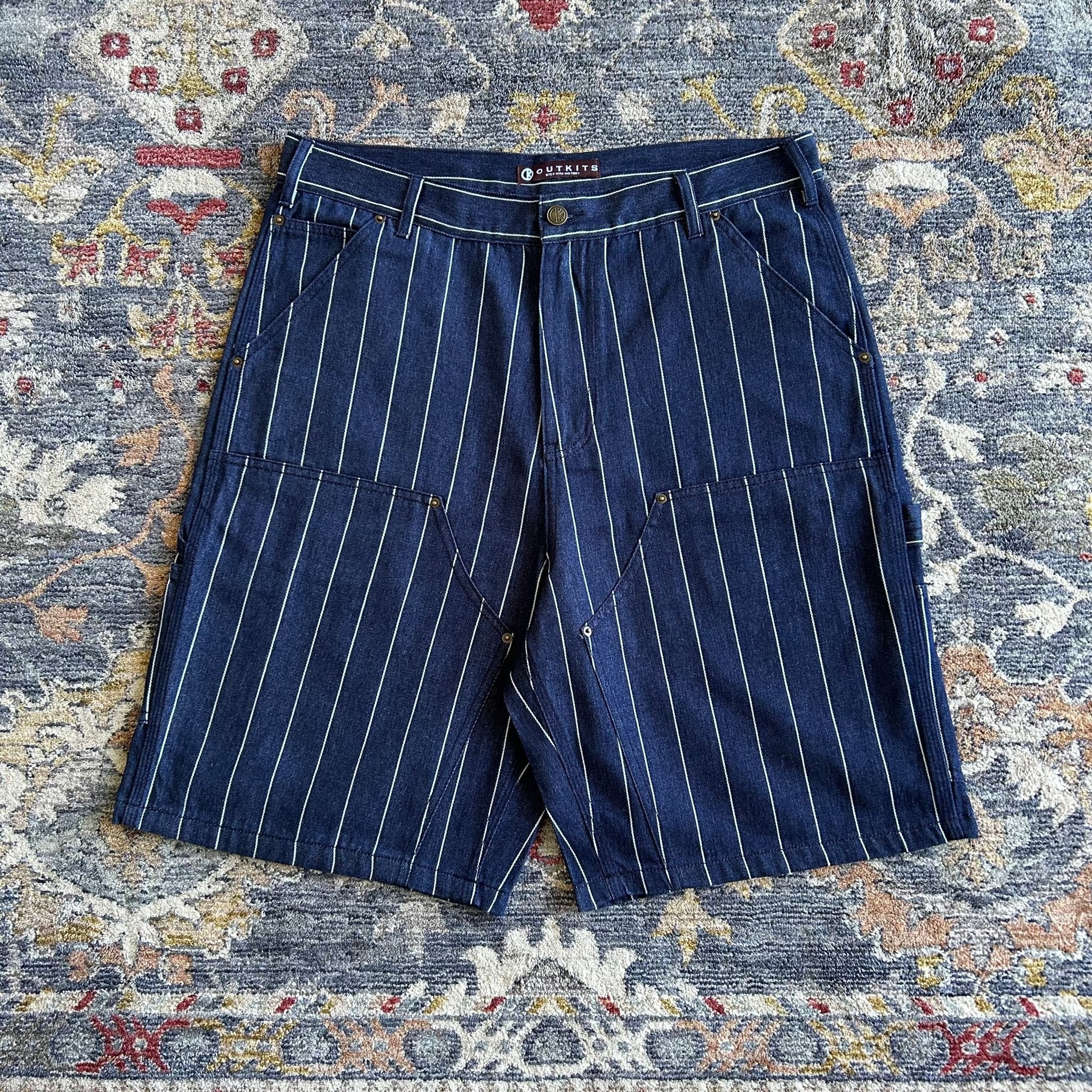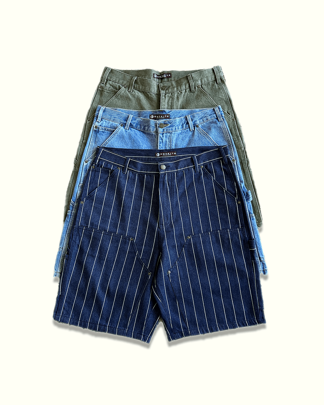 Our new Pinstripe DBL Knee Shorts are the first of their kind — made from 350 GSM striped denim and adorned with signature OUTKITS embellishments. A lighter version of our DBL Knee Shorts, perfect for summer.